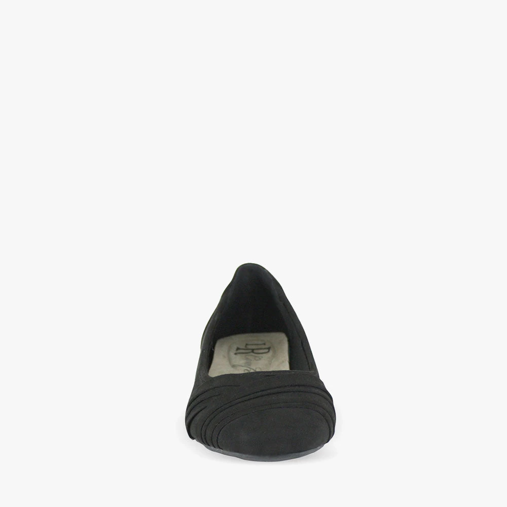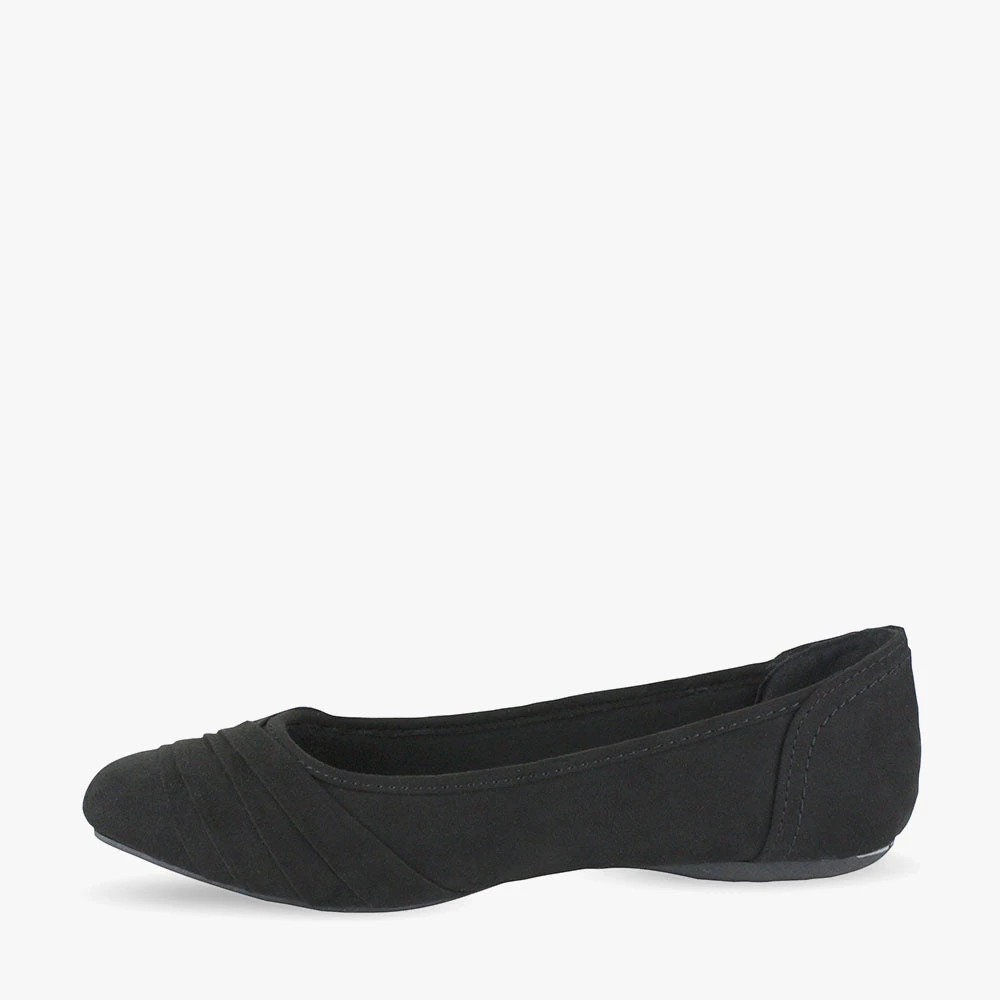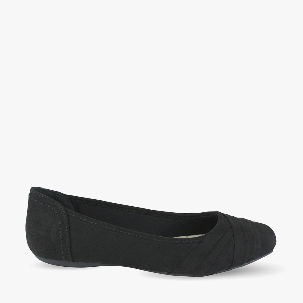 Kuzzle is a comfort ballet flat. Featuring a padded innersole and a pleat folded sash crossing the toes. Slip on these comfort flats for anything from office wear to picnics. These adaptable flats will cater to most of your ensembles. Pick up Kuzzle by London Rebel Comfort.