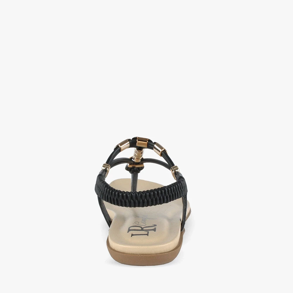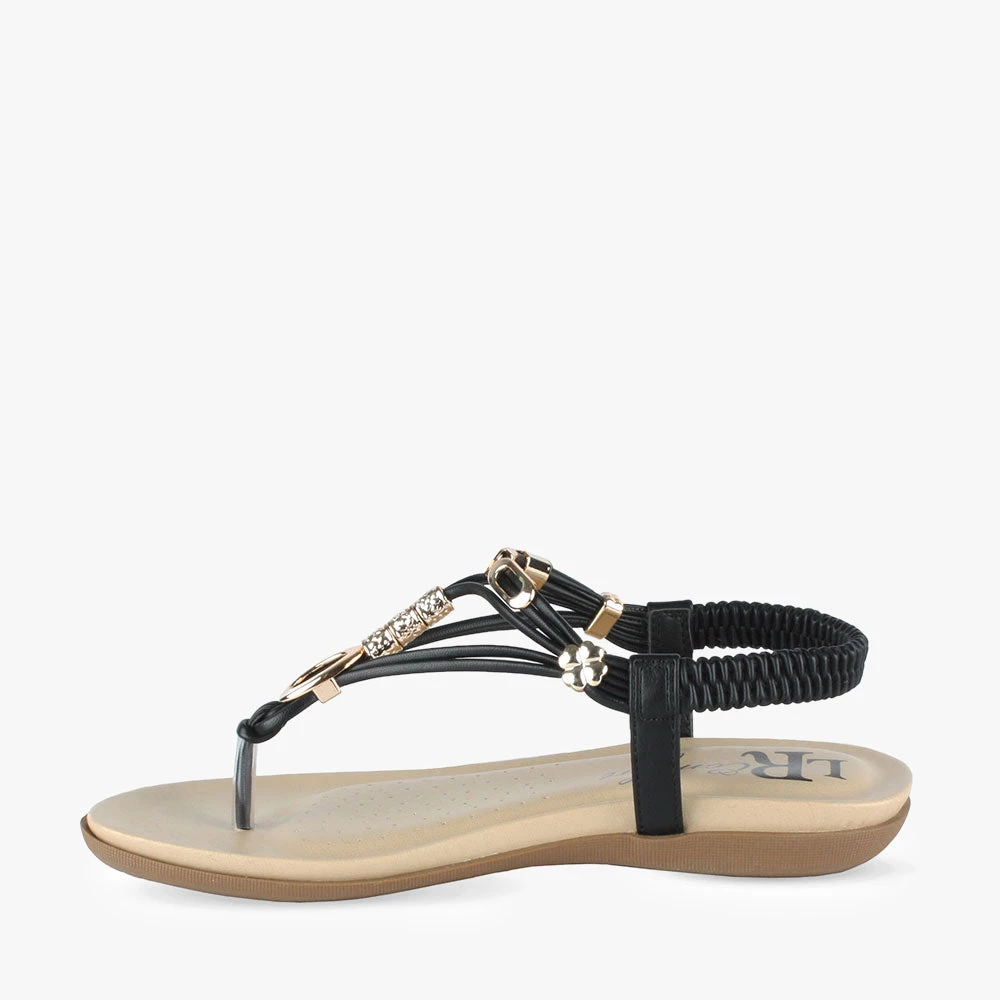 Clementine is a comfort sandal. Featuring a t-bar strap with gorgeous embellishments, this sandal is a great option to take you from day time to play time on your next holiday! An elasticized back and padded insole makes for comfortable and easy wear. Wander around in Clementine sandals by London Rebel Comfort.