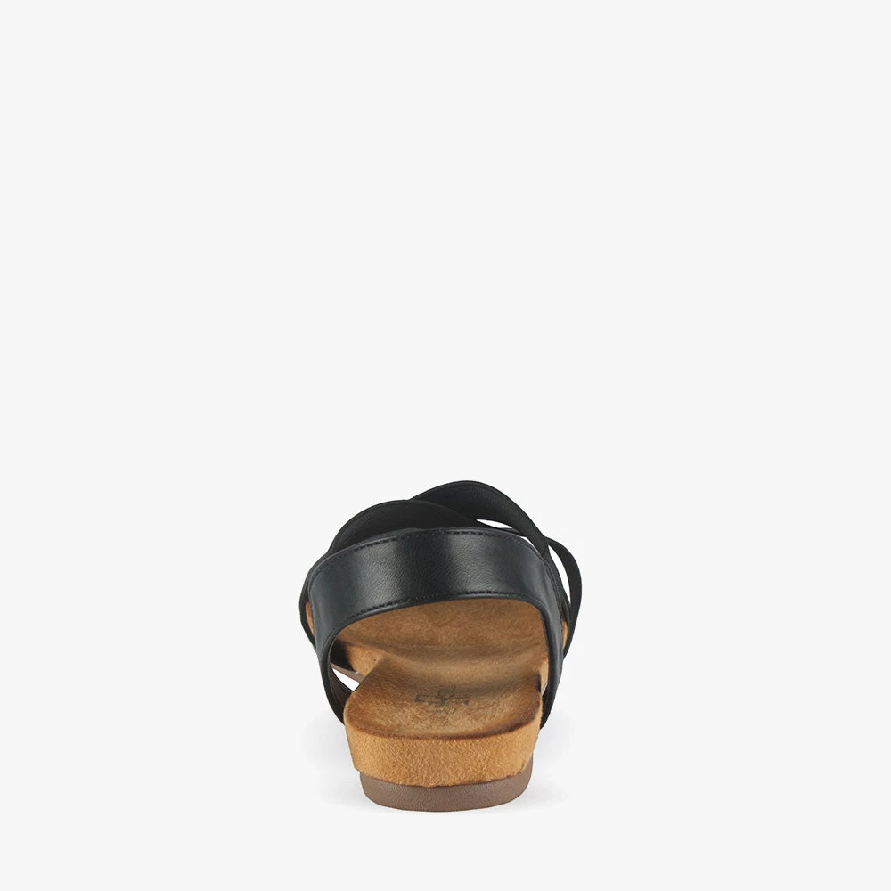 Everyday is a strappy sandal. Featuring a single strap across the toes and two similar elastic straps crisscrossing the vamp and adjoining a leather like ankle strap. The versatility and comfort of these sandals make it your ideal everyday sandal. Pair with jeans and your fave graphic tee for errand runs or throw on a playful dress for sunny adventures. Slip on Everyday by London Rebel.