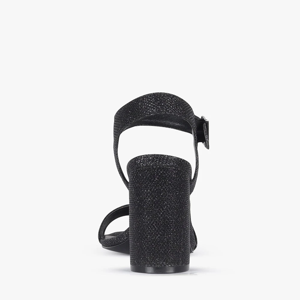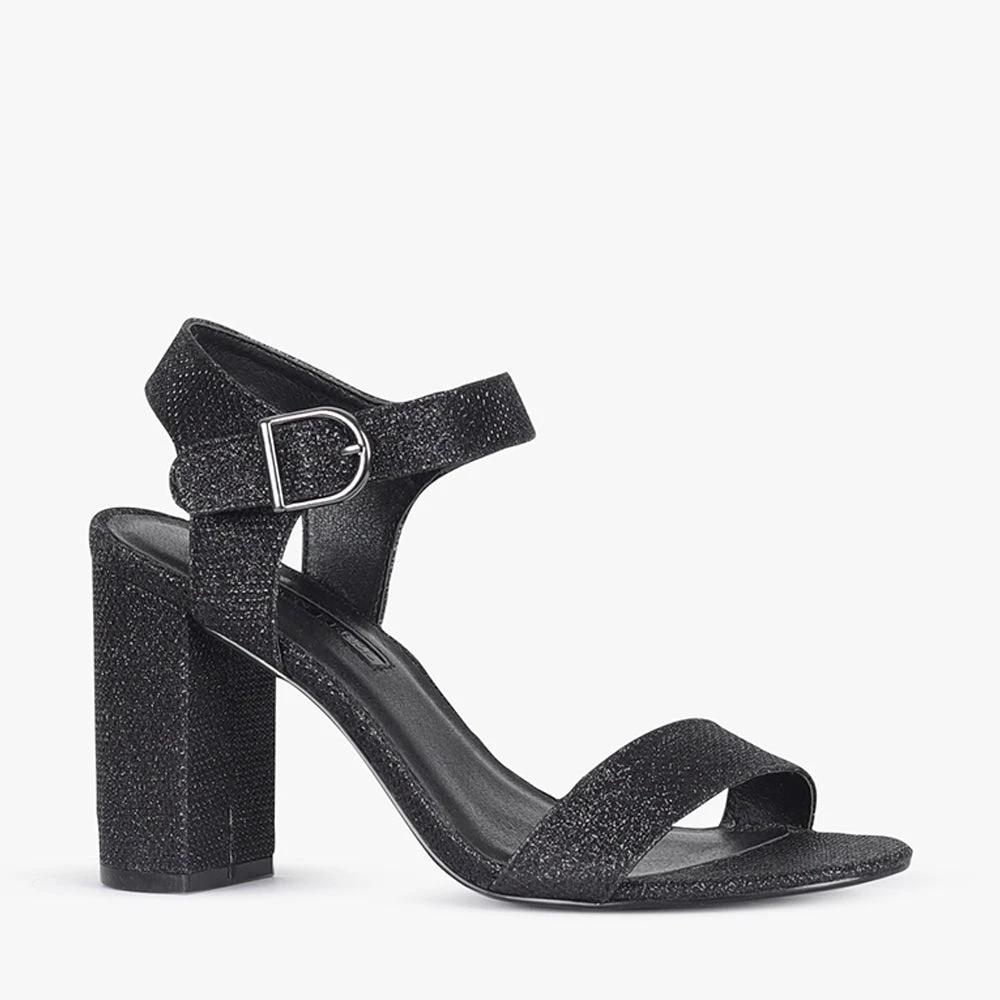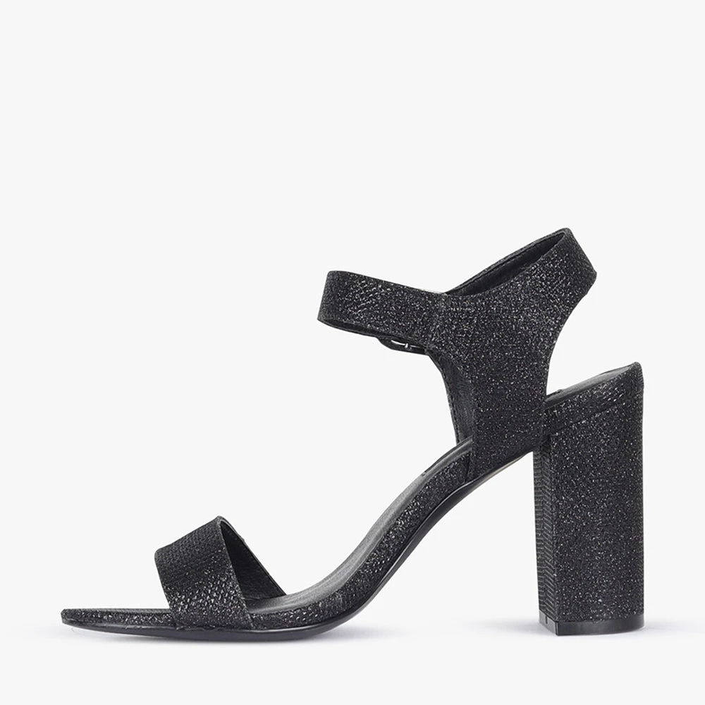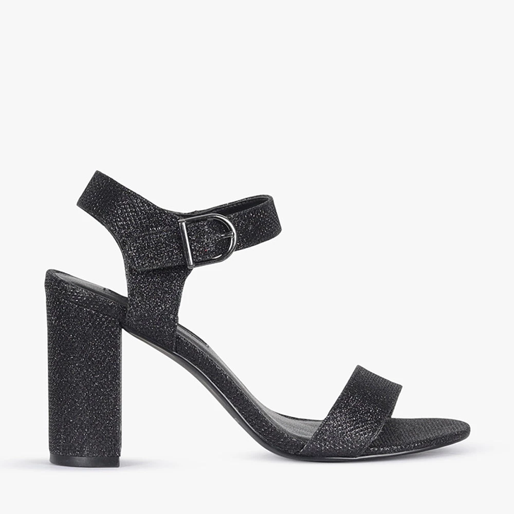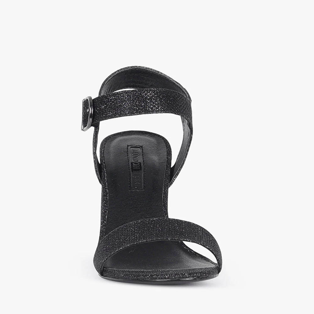 Haimie is a high heel. Featuring a block heel, over the toe strap and buckled ankle strap. The perfect shoe to add glitz to your night, team Haimie heels with a LBD and statement earrings for a night on the town with these black shimmery babes by London Rebel.