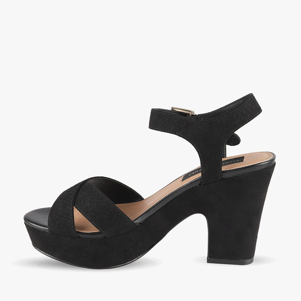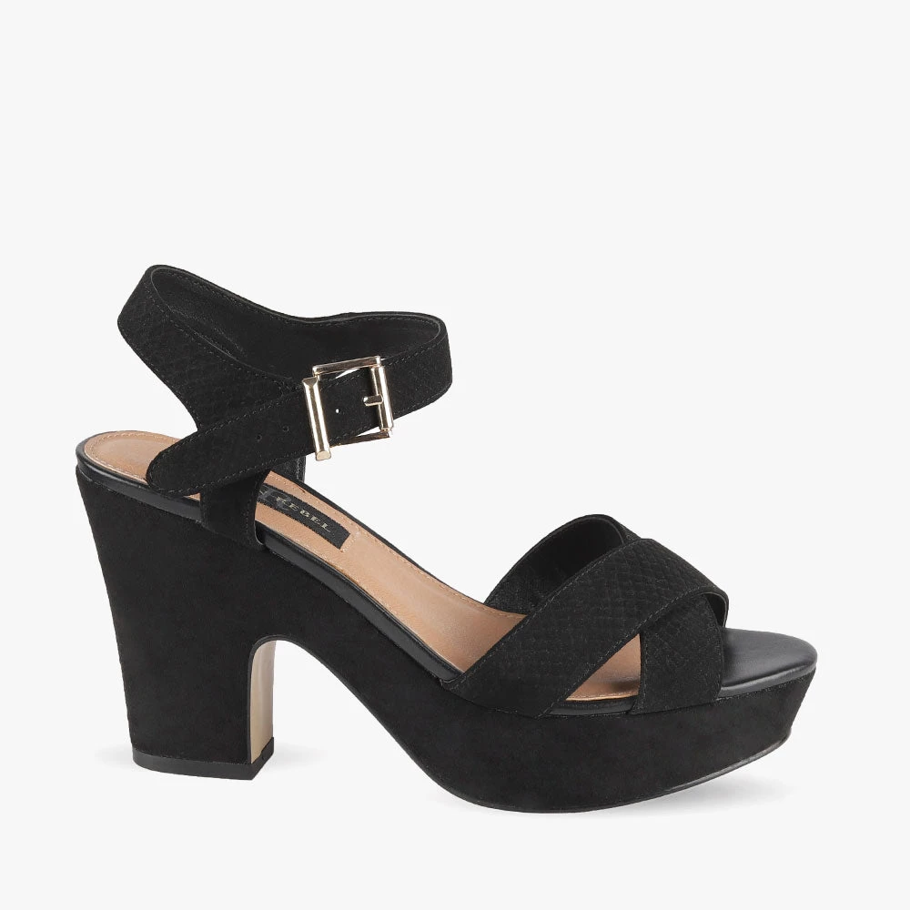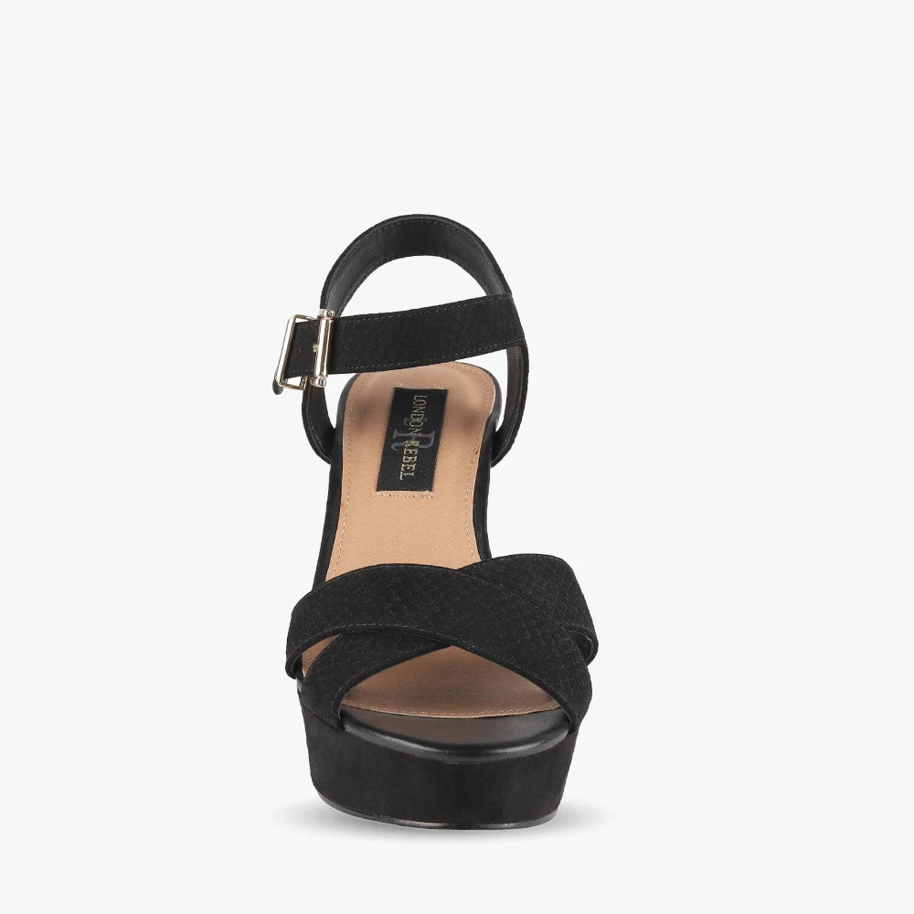Josie is a platform sandal. Featuring a snakeskin imprint criss-cross strap across the toes and a cork look platform. This style emulates all things 70’s and looks fabulous paired with cropped jeans and a colourful blouse. Be groovy in Josie platforms by London Rebel.