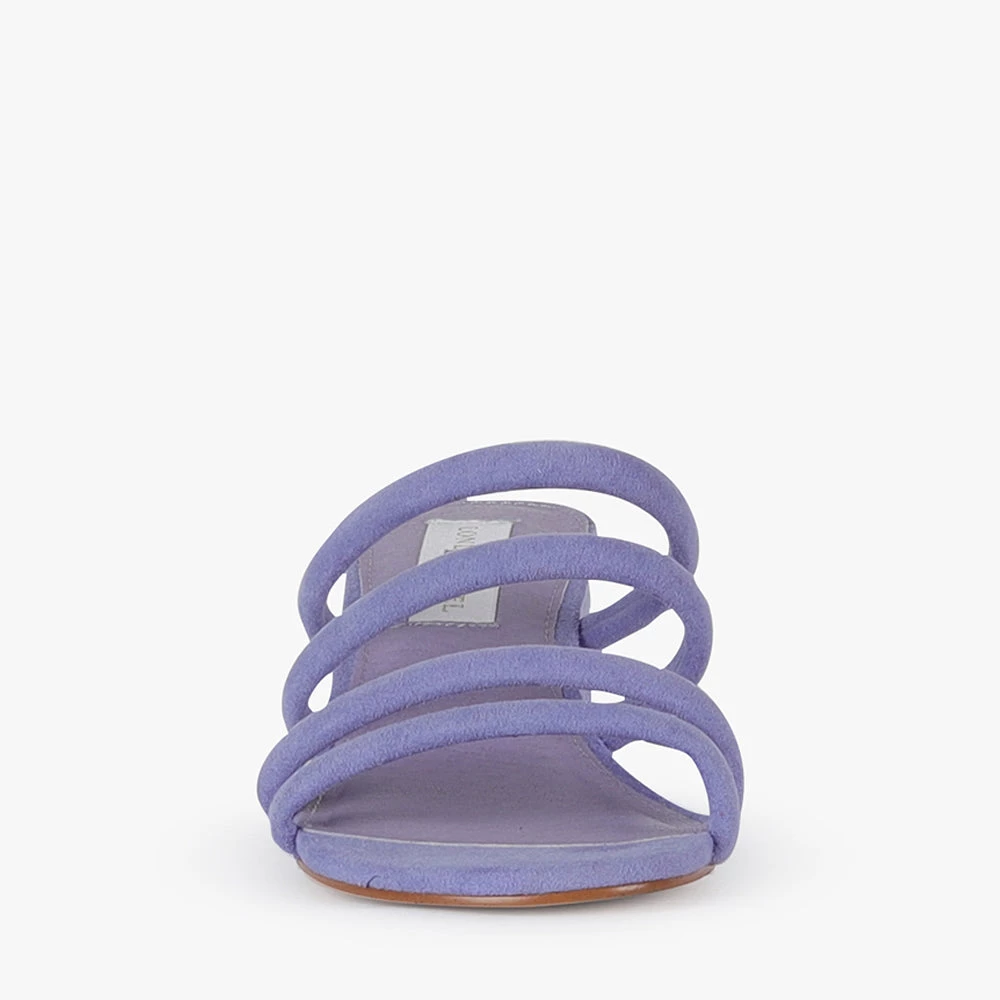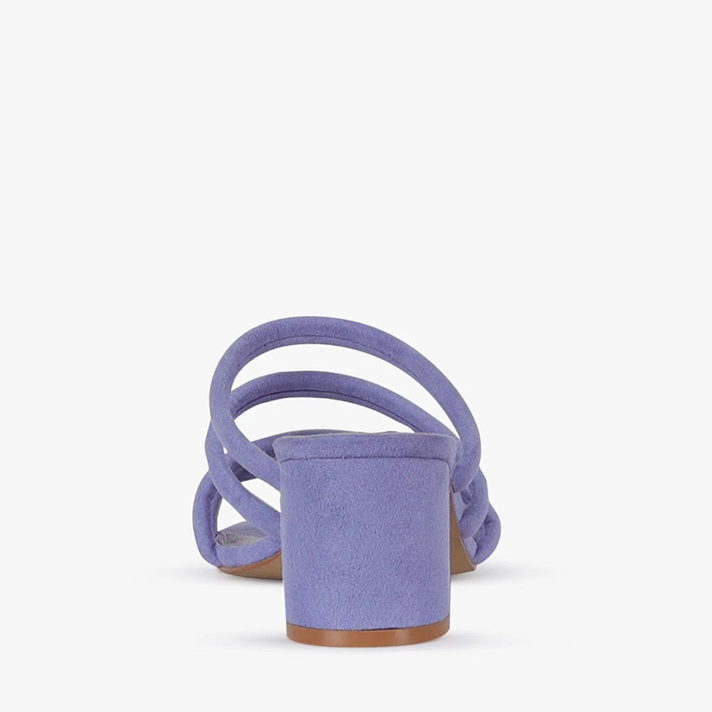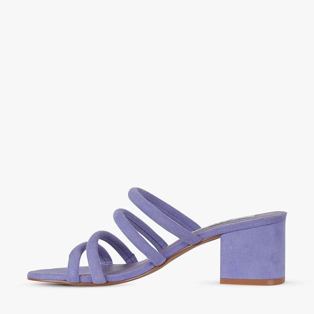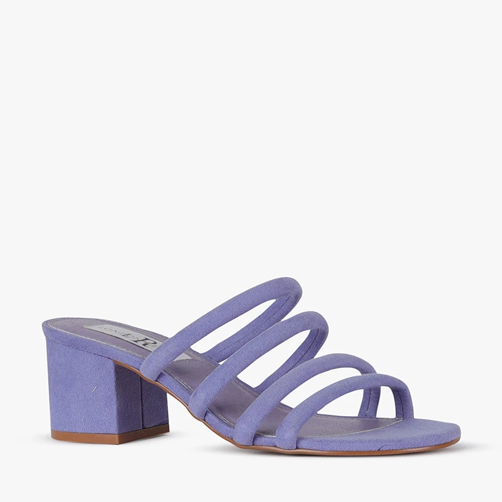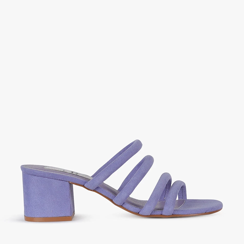 Featuring a mid block heel and four straps running horizontally up the vamp. Team these pop of colour trendy mules with light blue skinny jeans and white top. Clear the way in Gizaa heels by London Rebel.