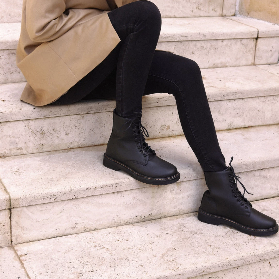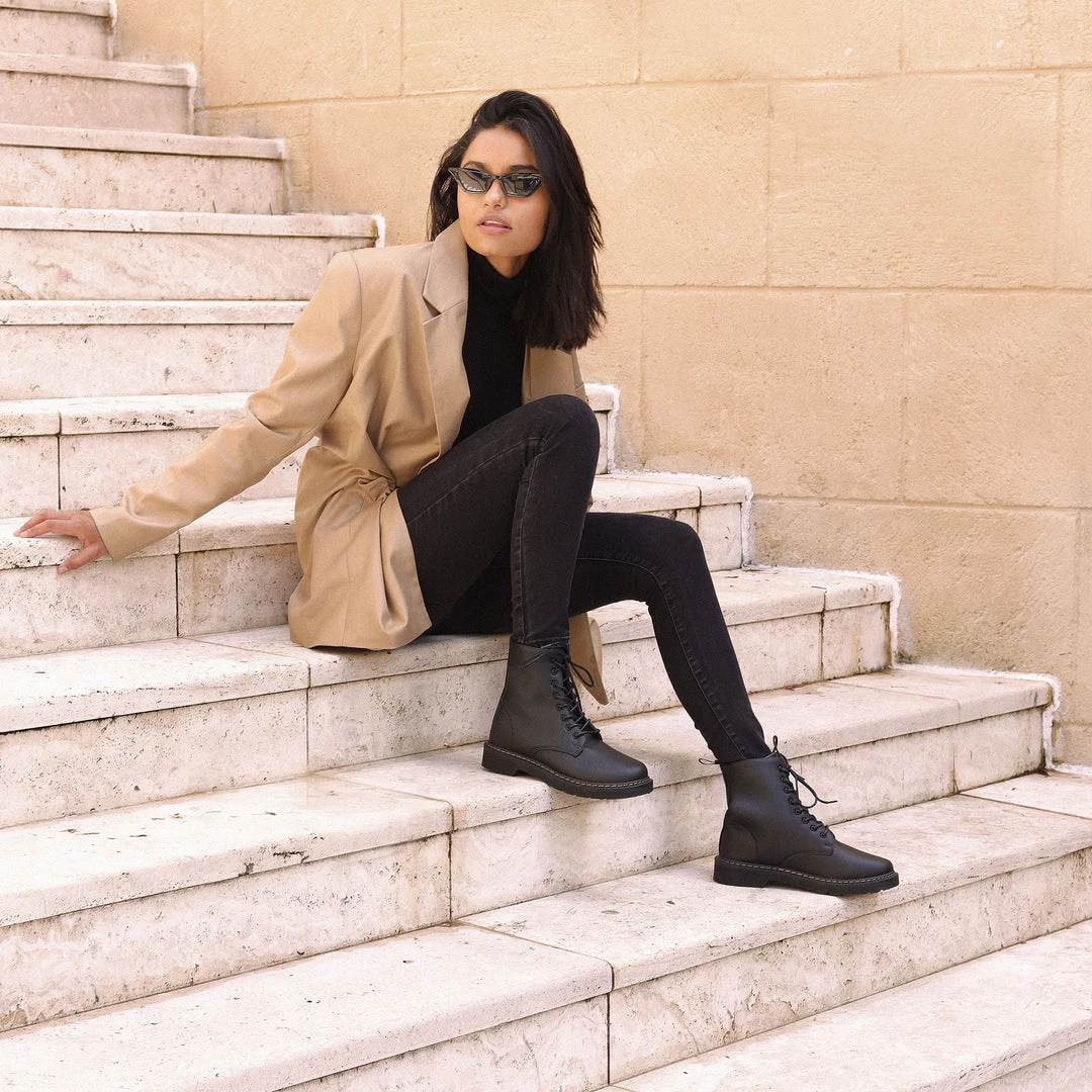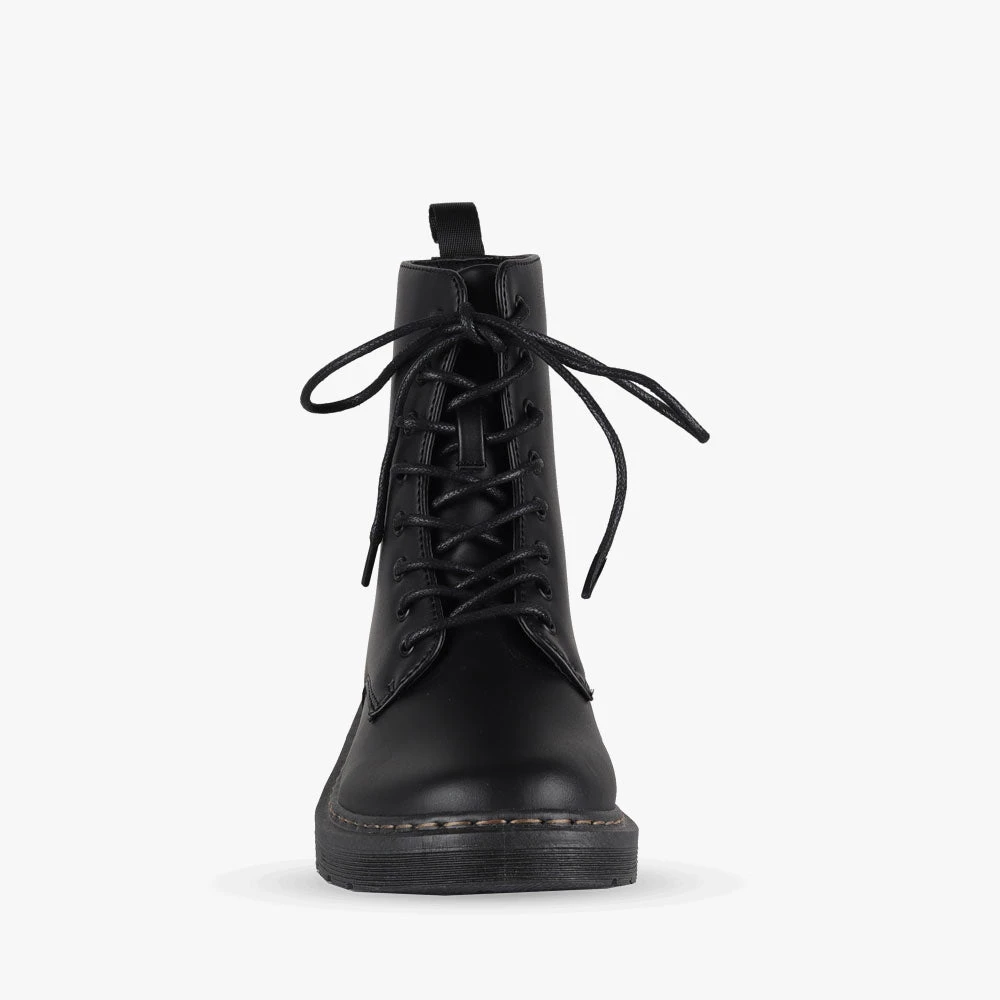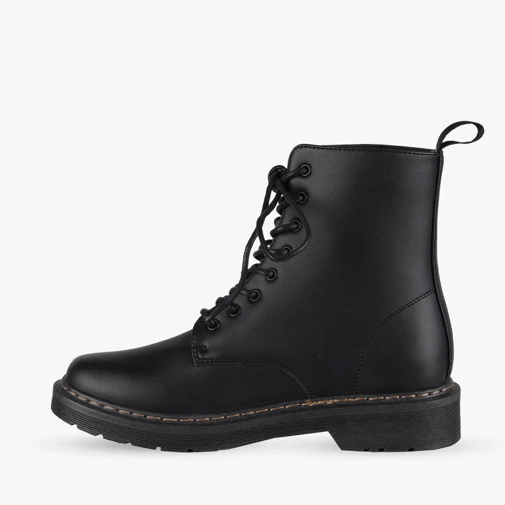 Featuring a chunky treaded sole with exposed stitching, and a minimalist style lace up finish. Cut above the ankle with a back pull tab. Pair with a flowy short dress for a girly edge, or your favourite denim skirt and band tee for the ultimate grunge look! Step out in the Rookie boots by London Rebel.