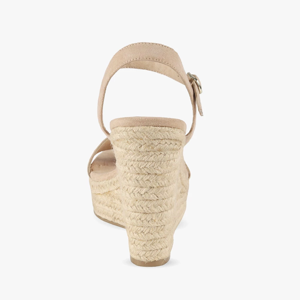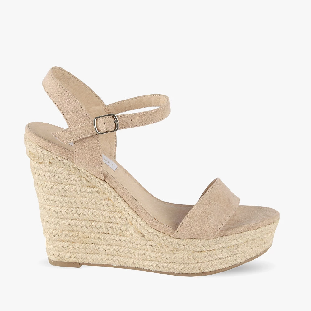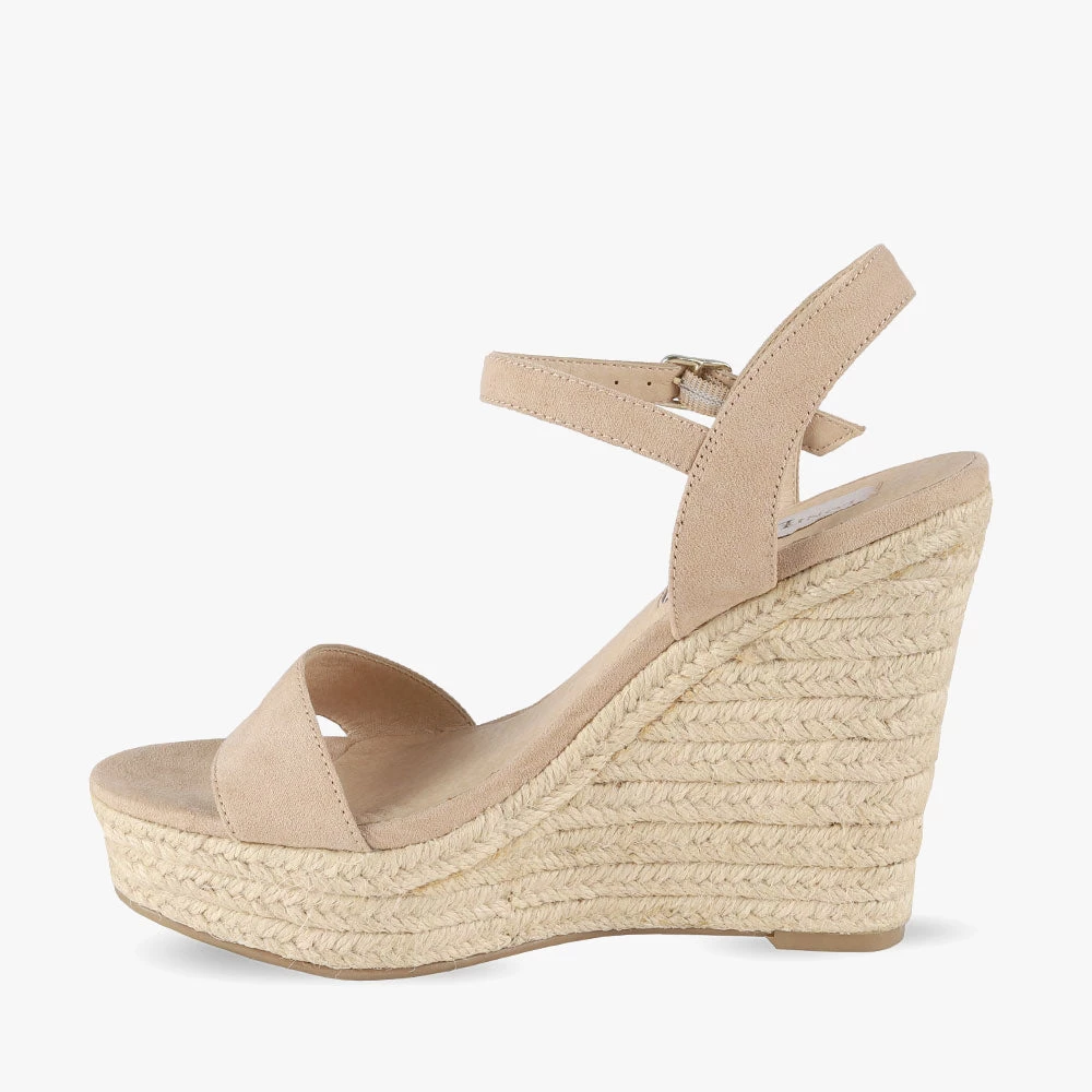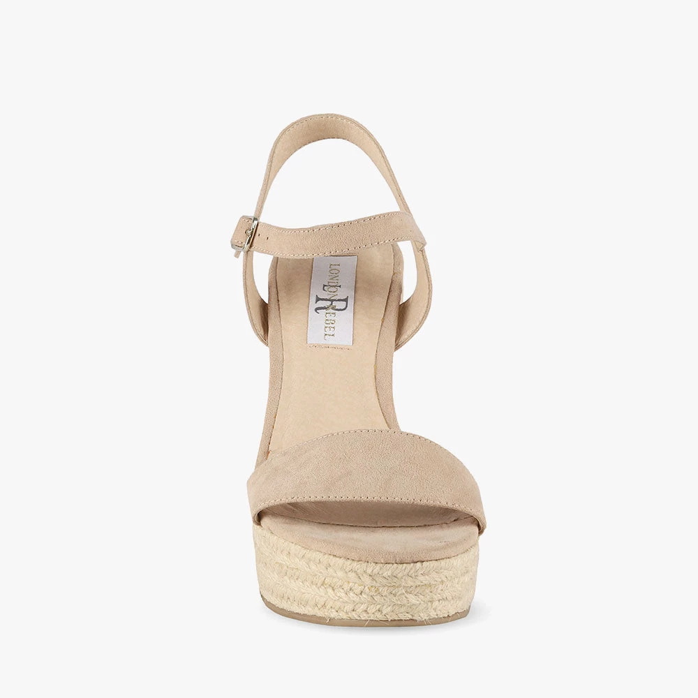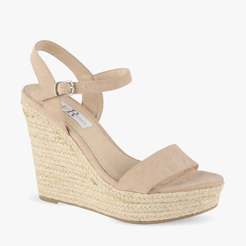 Vamos is an espadrille wedge. Featuring a braided jute sole with a strap across the toes and encircling the ankle. This style is SO on-trend. Wear with a 70’s inspired floral dress for the ultimate look! Step into Vamos wedges by London Rebel.