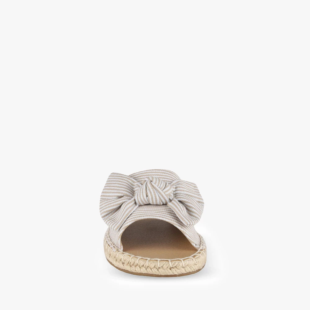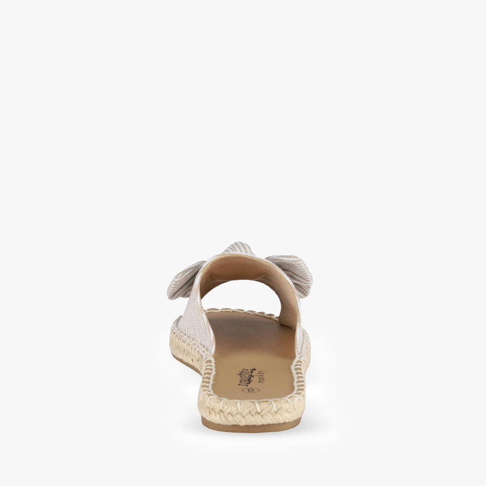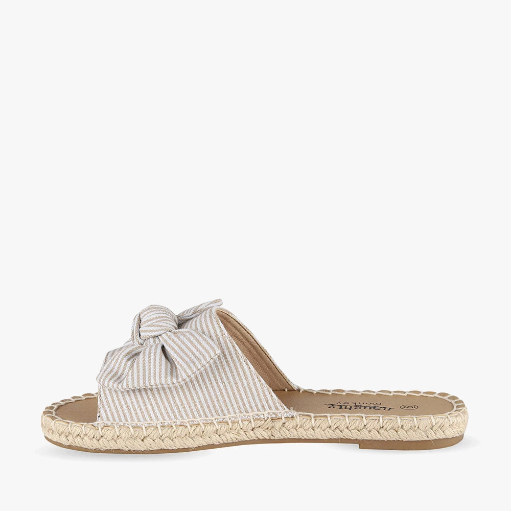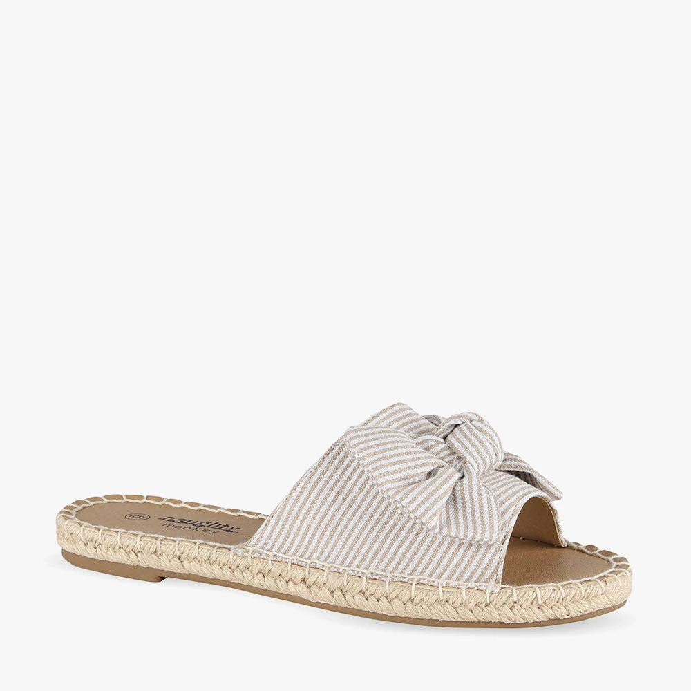 Minty is a slide sandal featuring espadrille trimming around the sole and a statement bow. Minty is light and summery and will add a little playfulness to your day. Team these sandals with a frill-hem playsuit for a fun and flirty attitude. Step into Minty by Naughty Monkey.