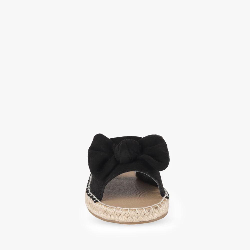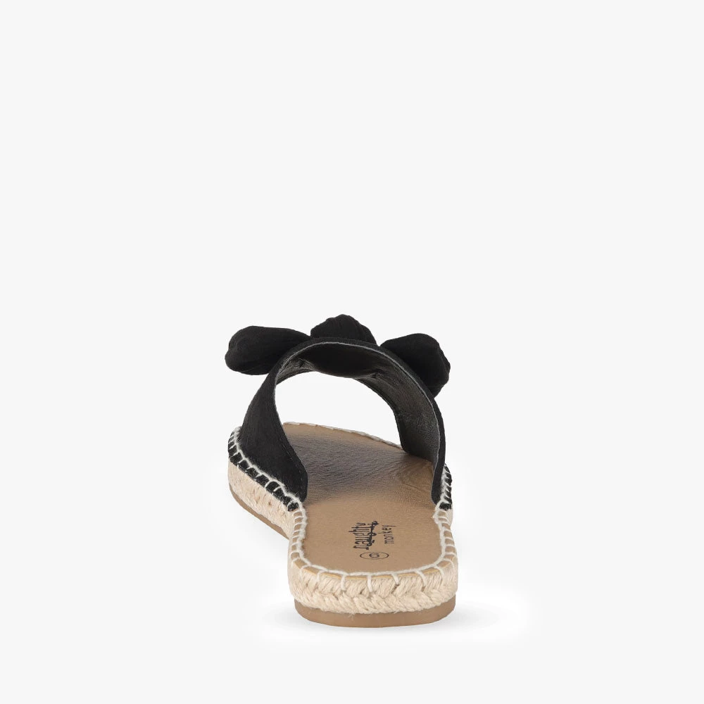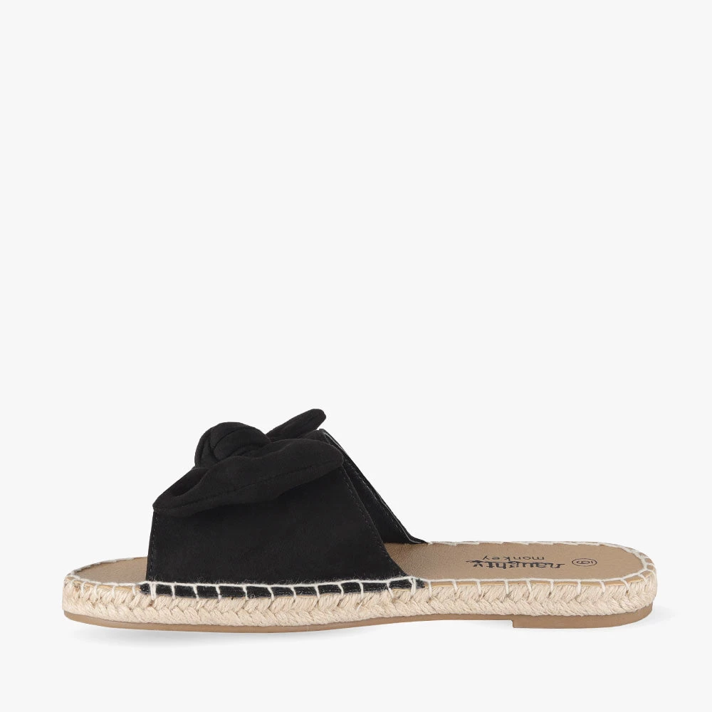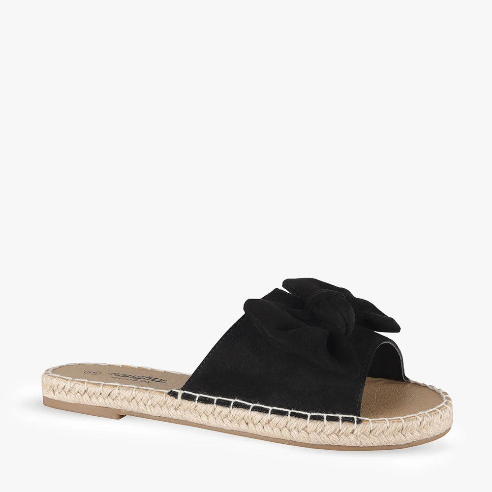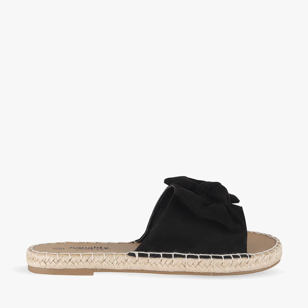 Minty is a slide sandal featuring espadrille trimming around the sole and a statement bow. Minty is light and summery and will add a little playfulness to your day. Team these sandals with a frill-hem playsuit for a fun and flirty attitude. Step into Minty by Naughty Monkey.