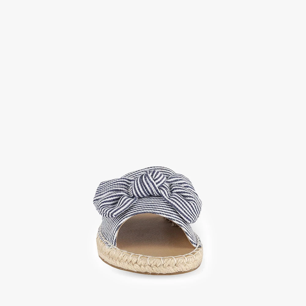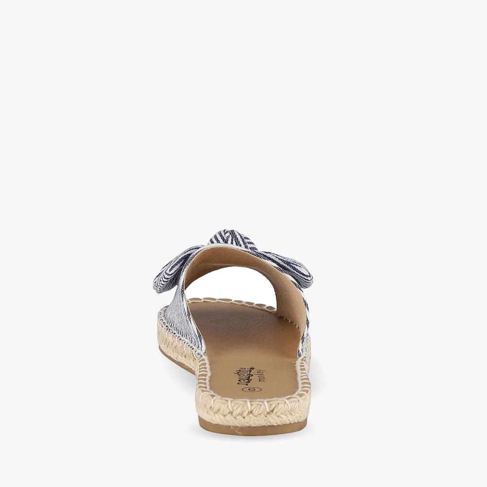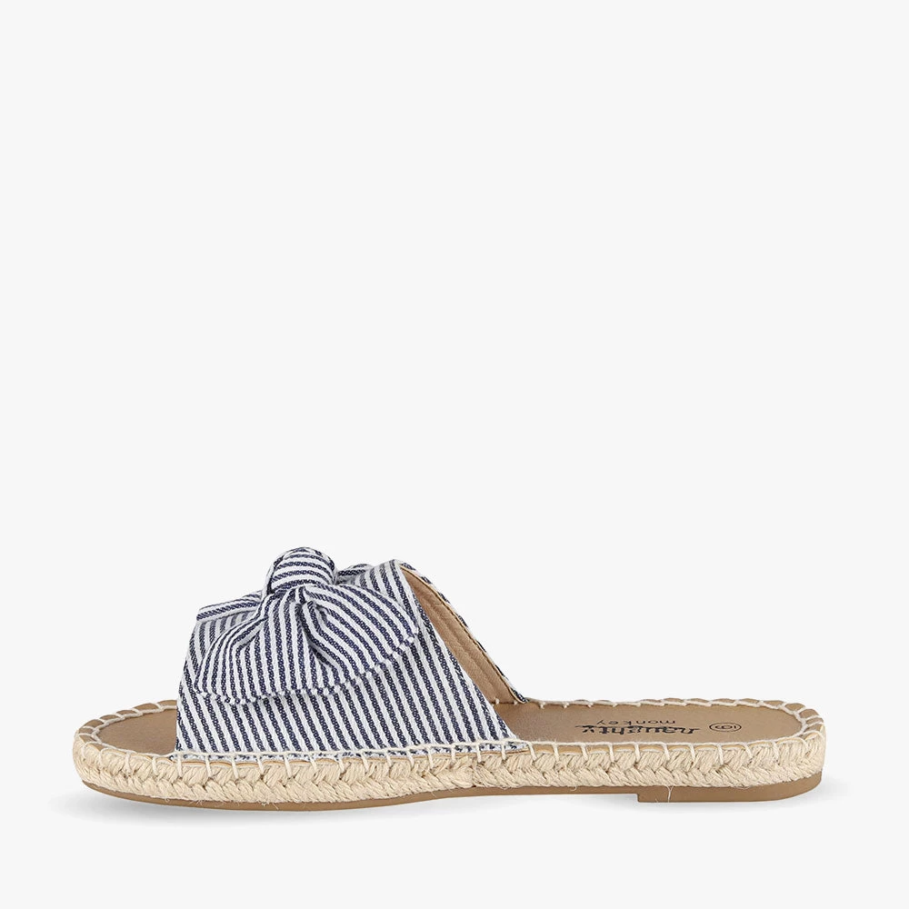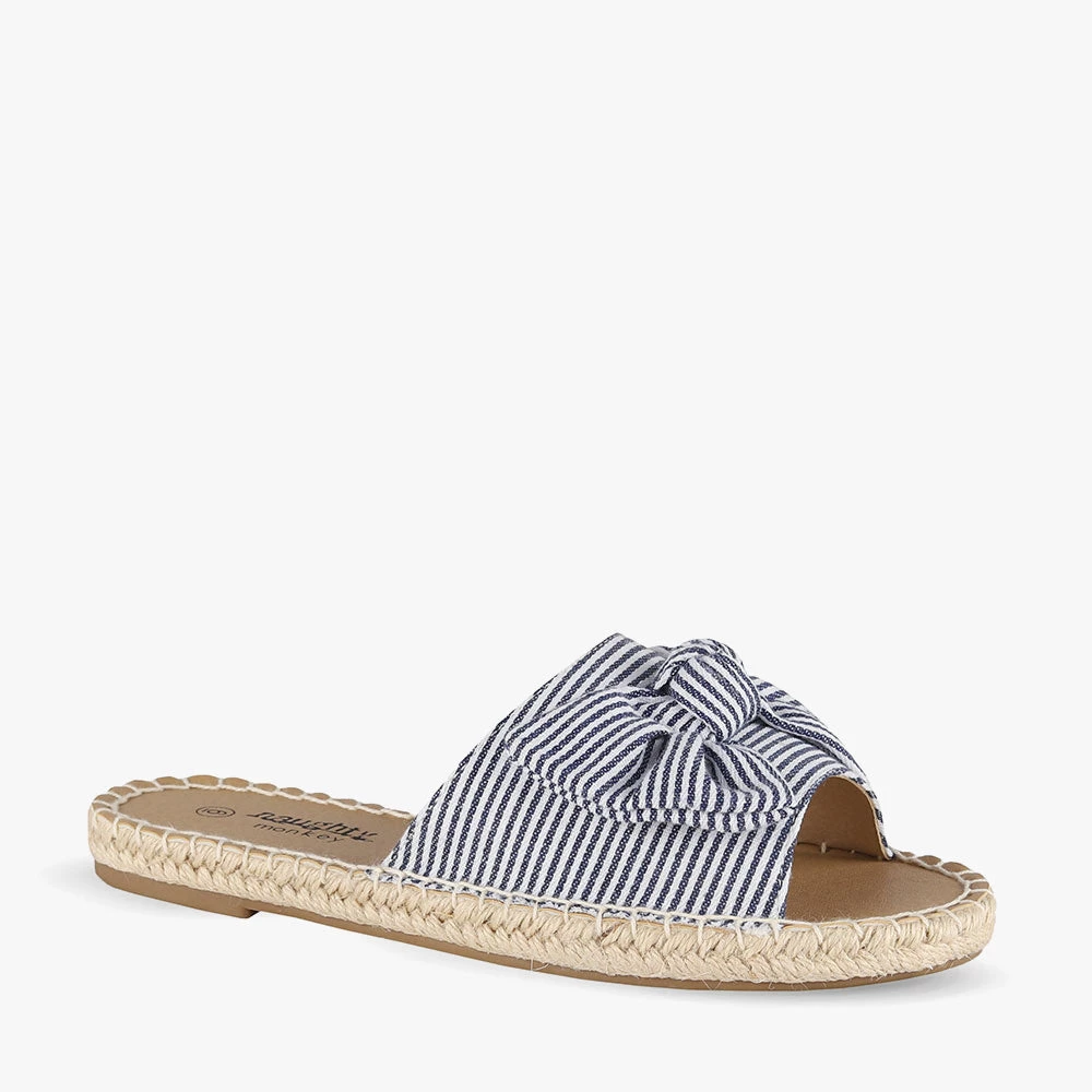 Minty is a slide sandal featuring espadrille trimming around the sole and a statement bow. Minty is light and summery and will add a little playfulness to your day. Team these sandals with a frill-hem playsuit for a fun and flirty attitude. Step into Minty by Naughty Monkey.