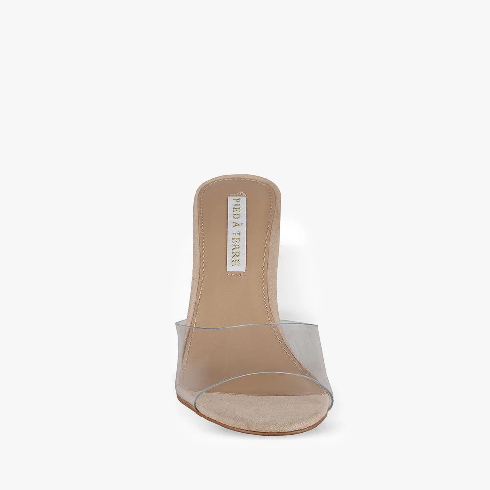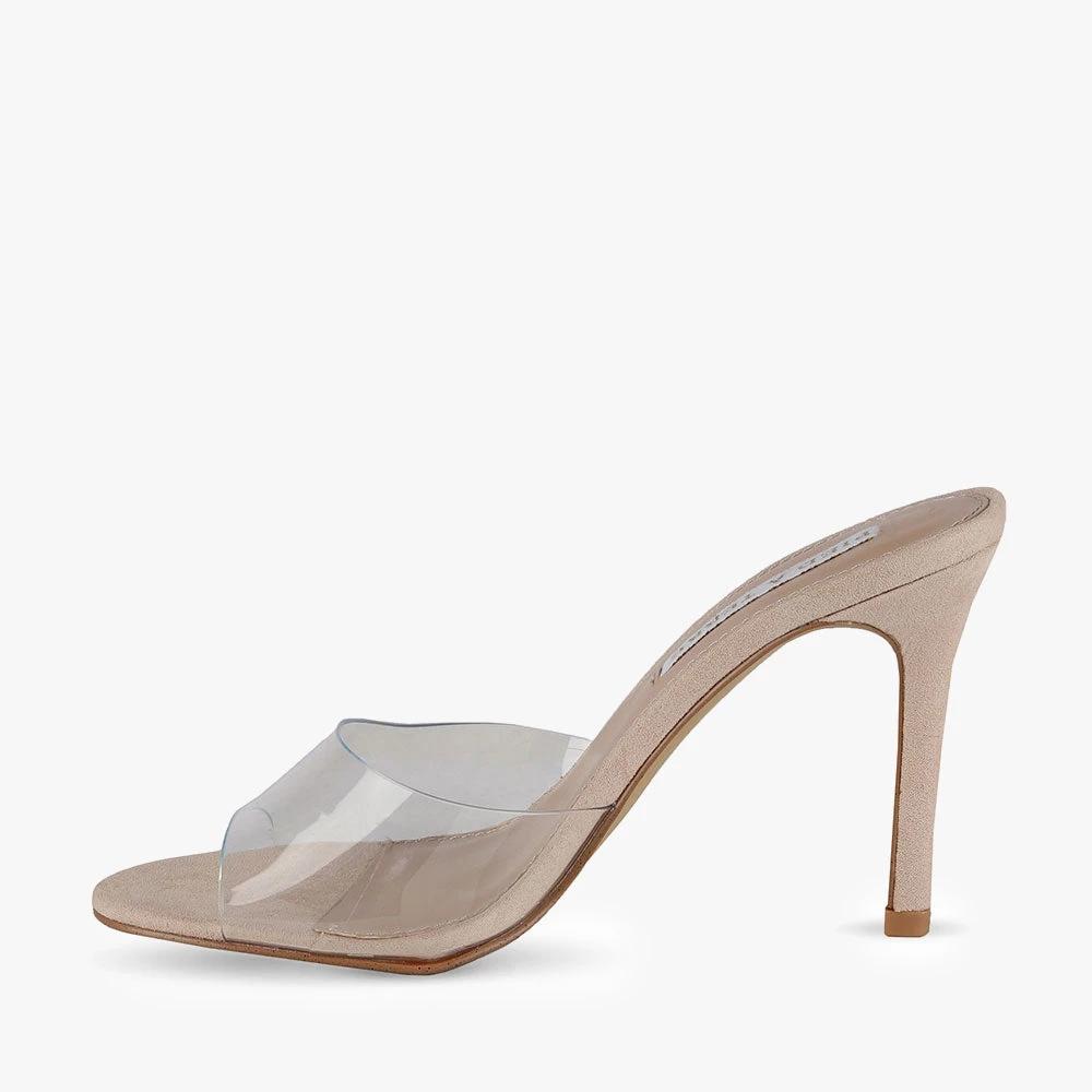 Estella is a high-heeled mule. Featuring a fashionable, clear perspex upper and high stiletto heel. Estella is feminine whilst still boasting attitude. Team the transparent Estella mules with a one-shouldered cocktail dress and a touch of red lippy. Step out in style with Estella heels by Pied A Terre.