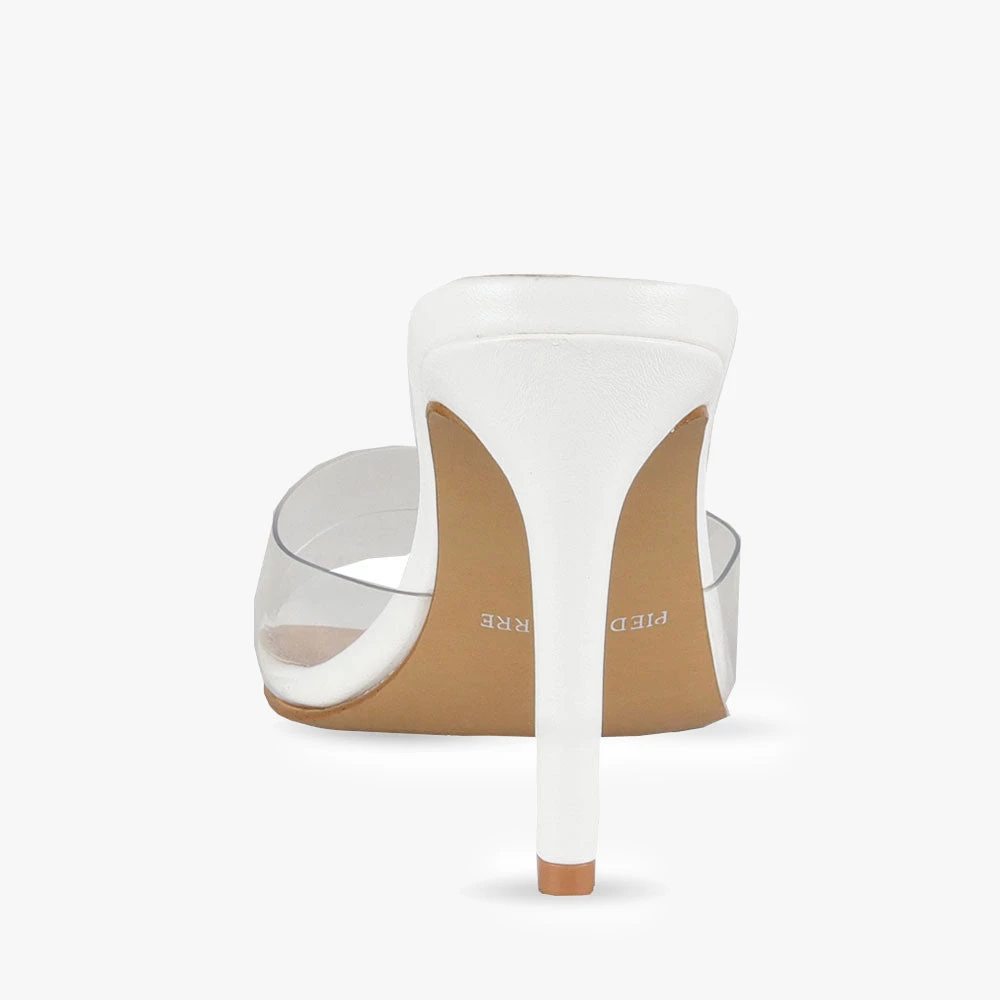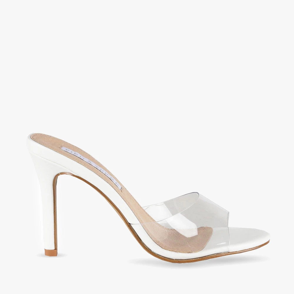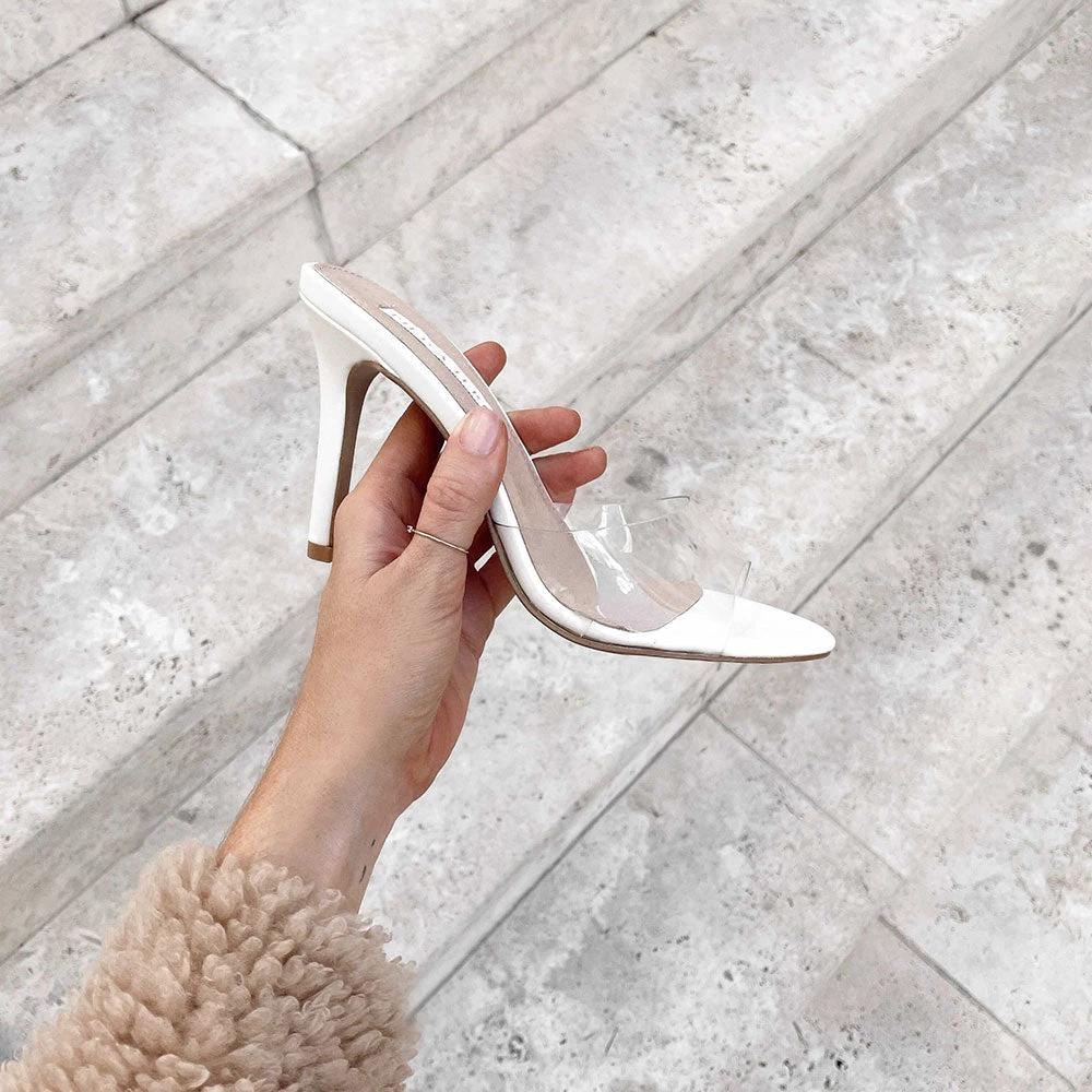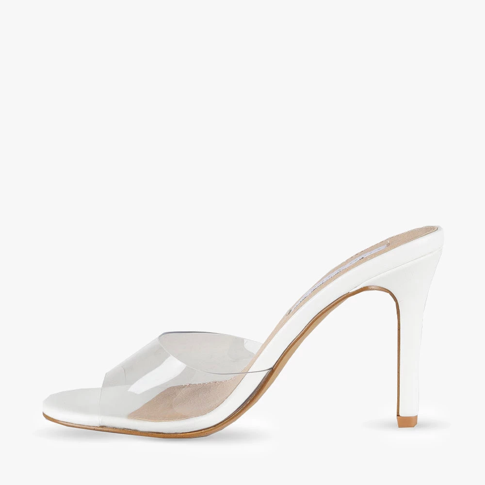 Estella is a high-heeled mule. Featuring a fashionable, clear perspex upper and high stiletto heel. Estella is feminine whilst still boasting attitude. Team the transparent Estella mules with a one-shouldered cocktail dress and a touch of red lippy. Step out in style with Estella heels by Pied A Terre.