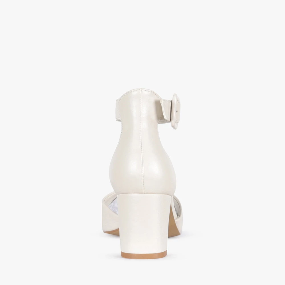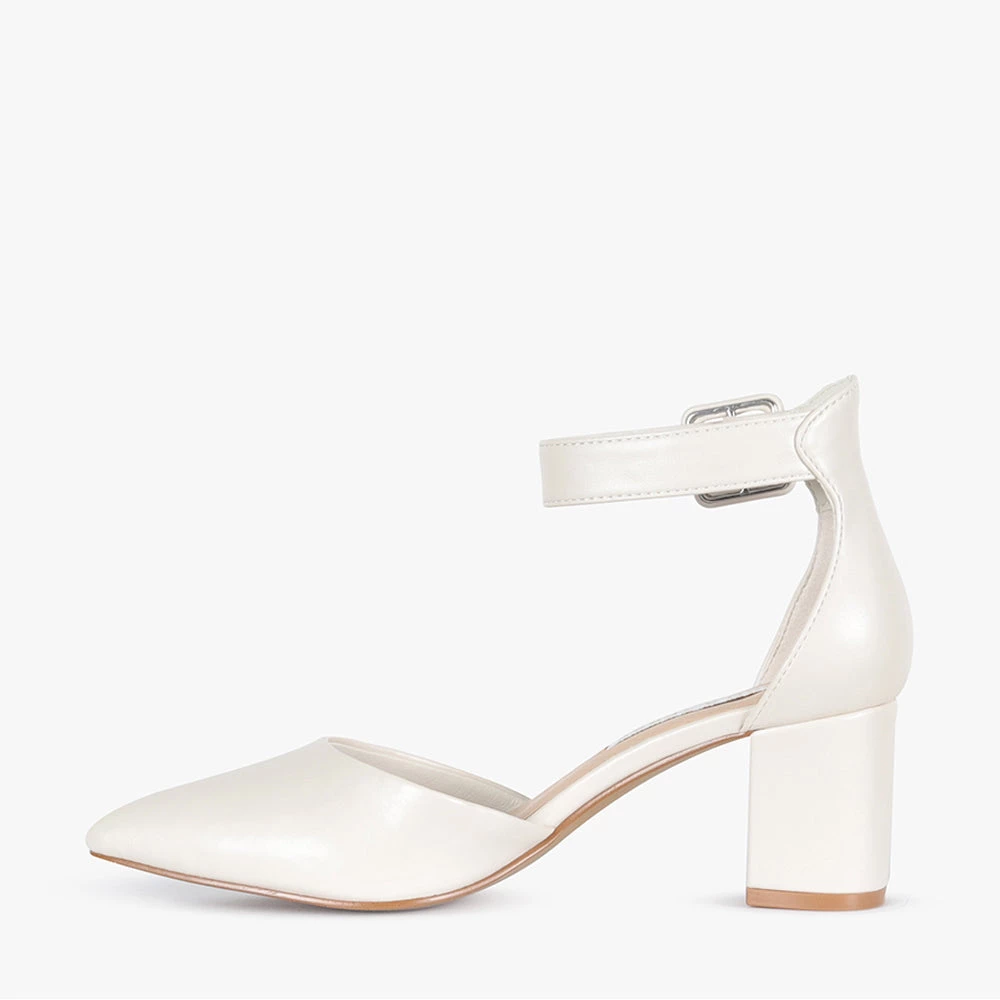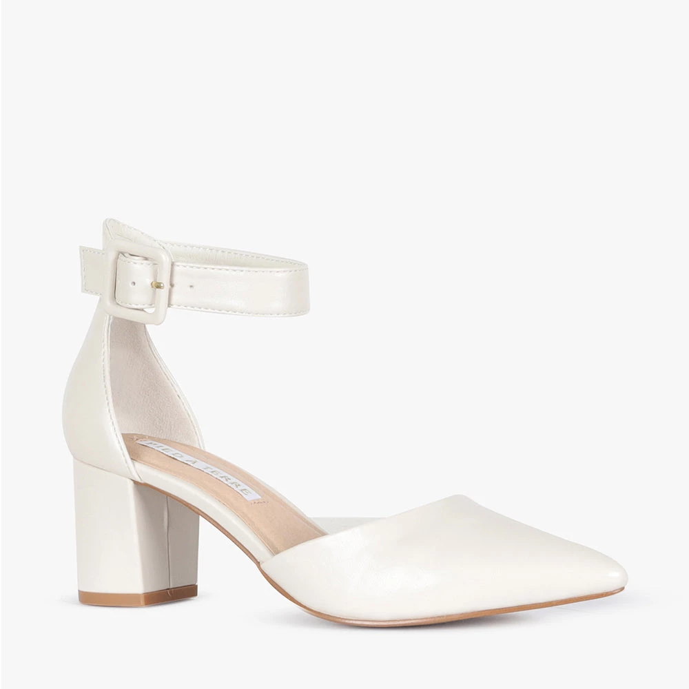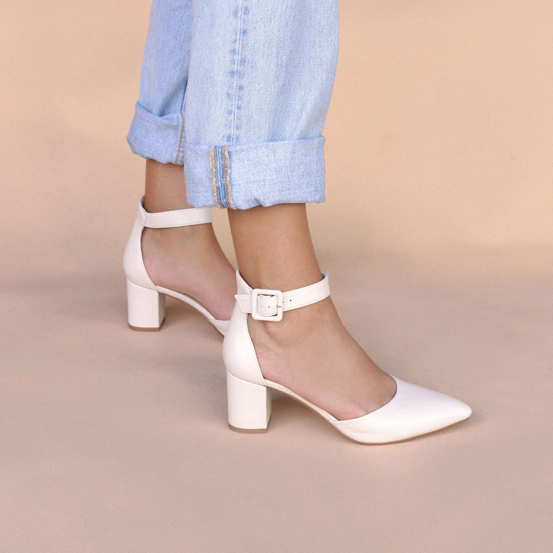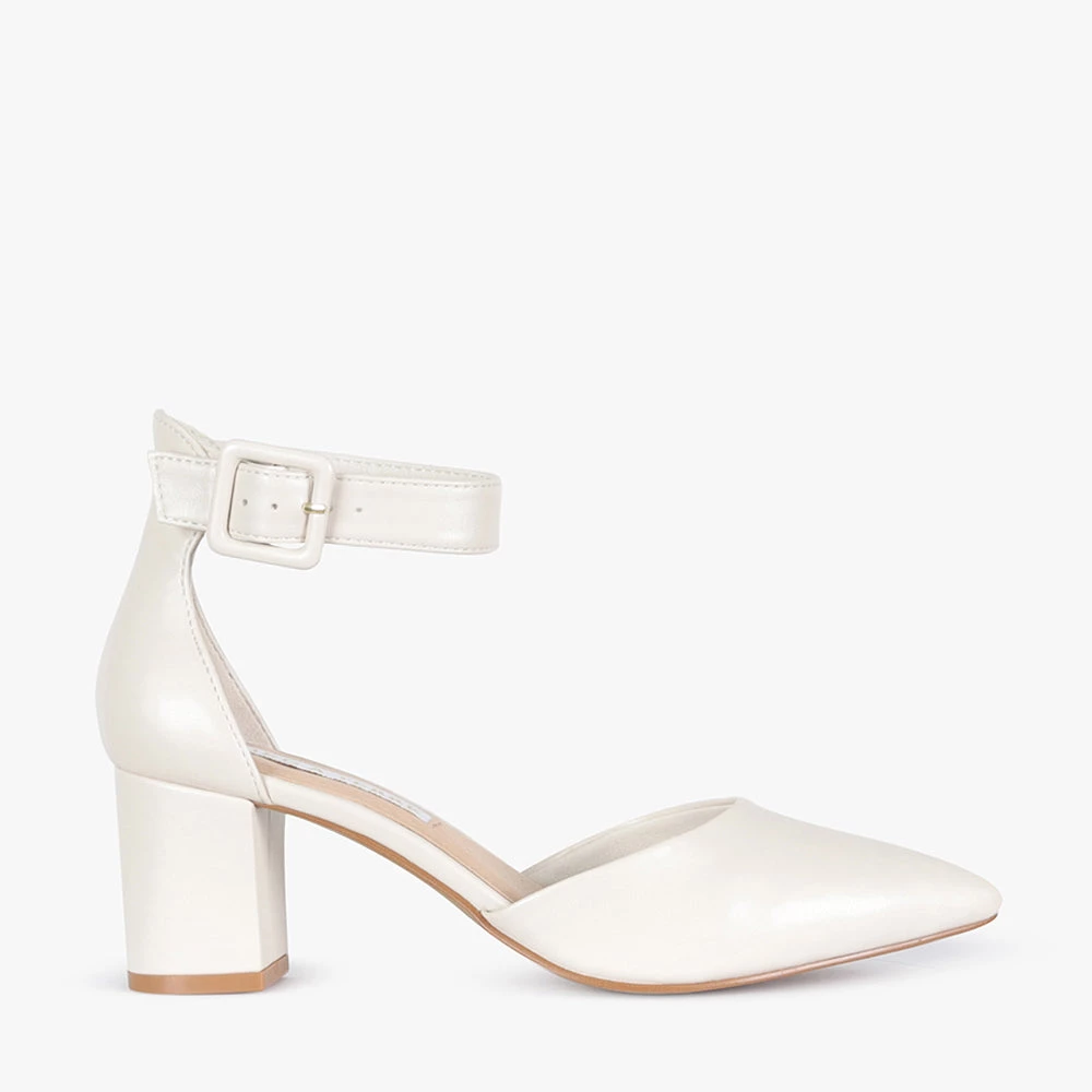 Lunchtime is a Bone coloured pointed toe heel. Featuring a strap around the ankle with a square buckle and a mid block heel. Lunchtime is trendy, classic and will fit into your wardrobe seamlessly. A great choice for the office or dressed up with a fun, flowy party dress. Put a pep in your step with Lunchtime heels by Pied A Terre.